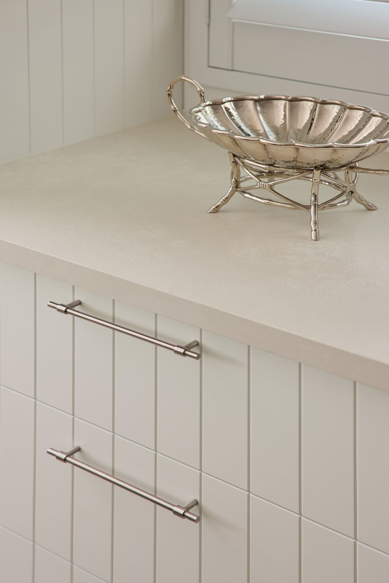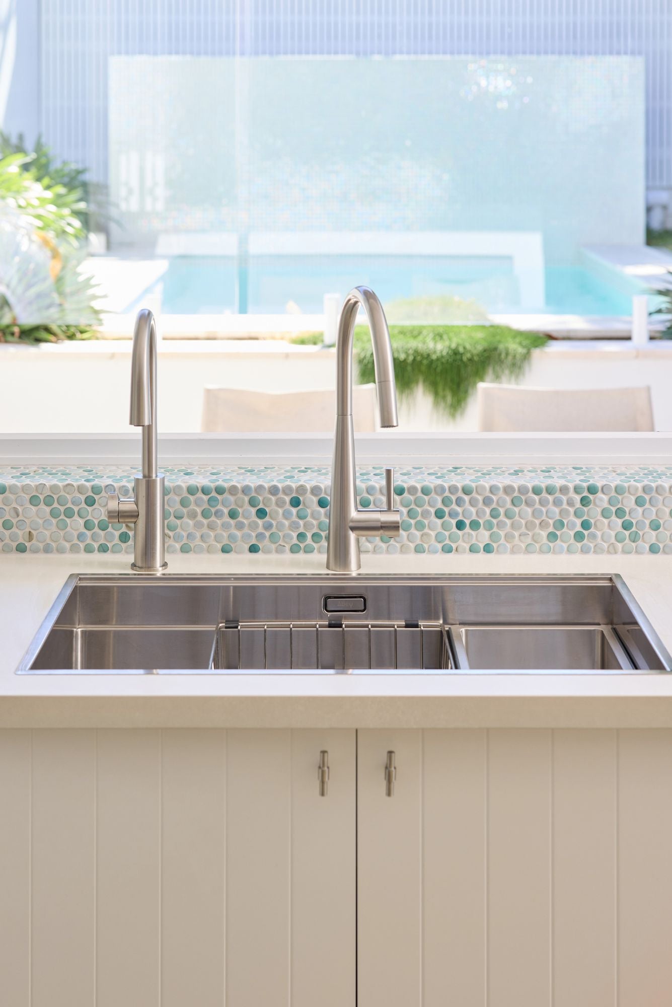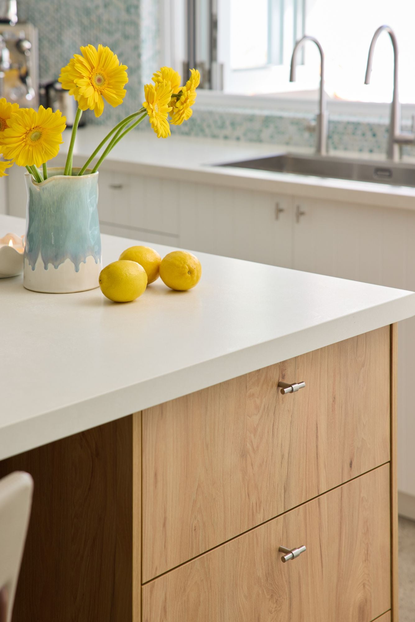 A bright and breezy coastal kitchen that perfectly captures the relaxed Bondi lifestyle — light-filled, fresh, and effortlessly balanced. The design brings together tactile finishes and natural textures, with a benchtop in QuantumZero Naturale Concrete grounding the sea-glass mosaic tiles and warm timber accents. A seamless connection to the garden enhances the sense of openness and calm, creating a space that feels both functional and serene.