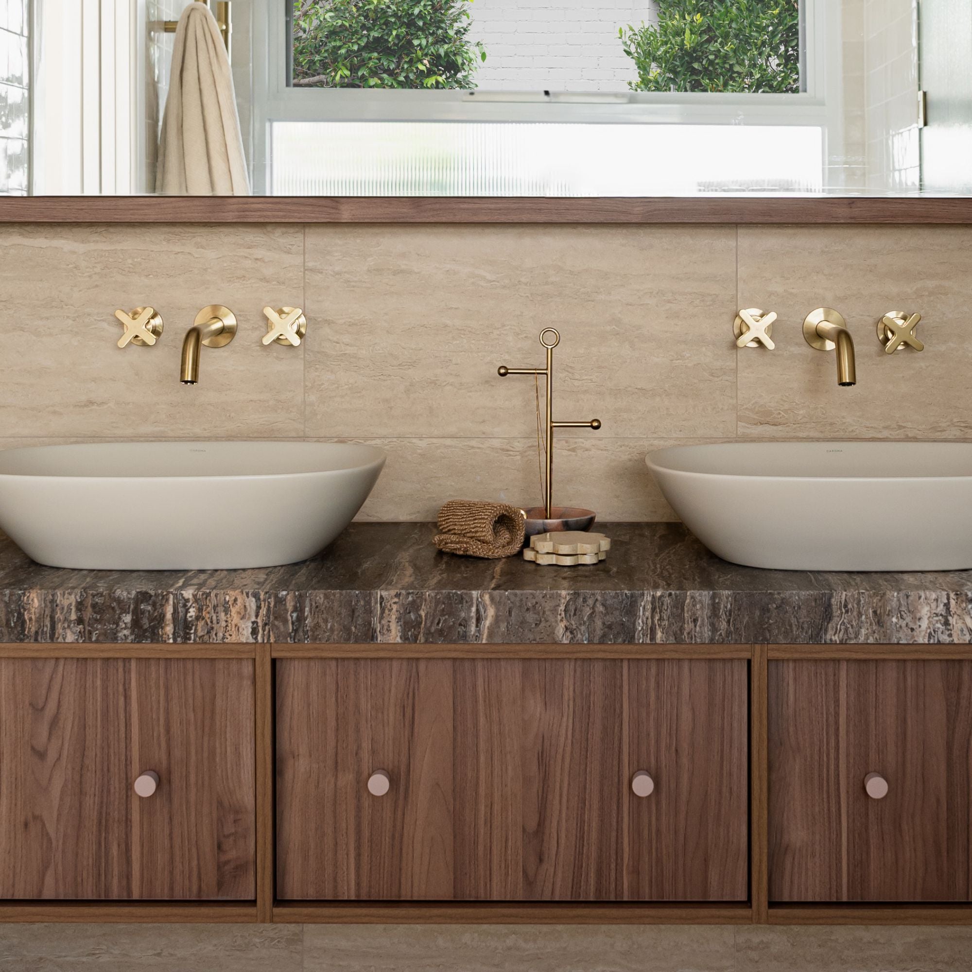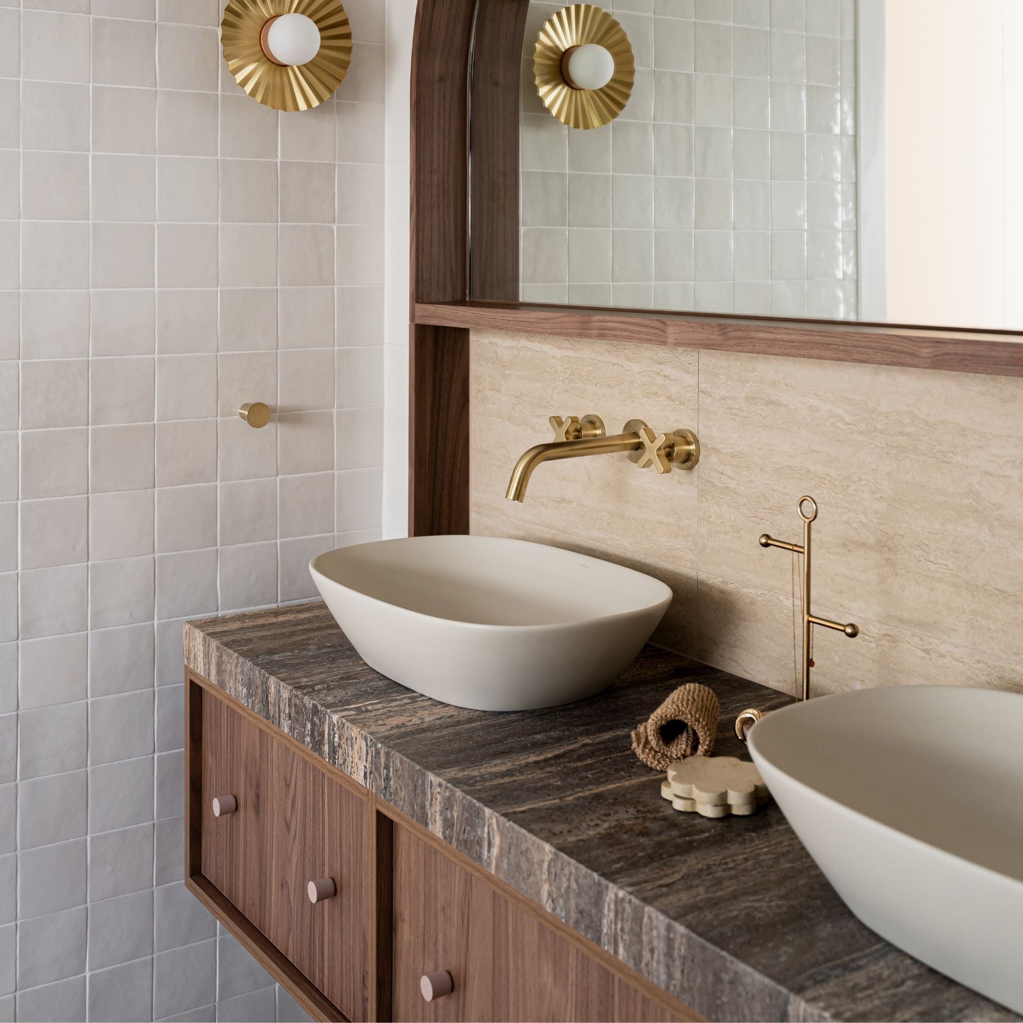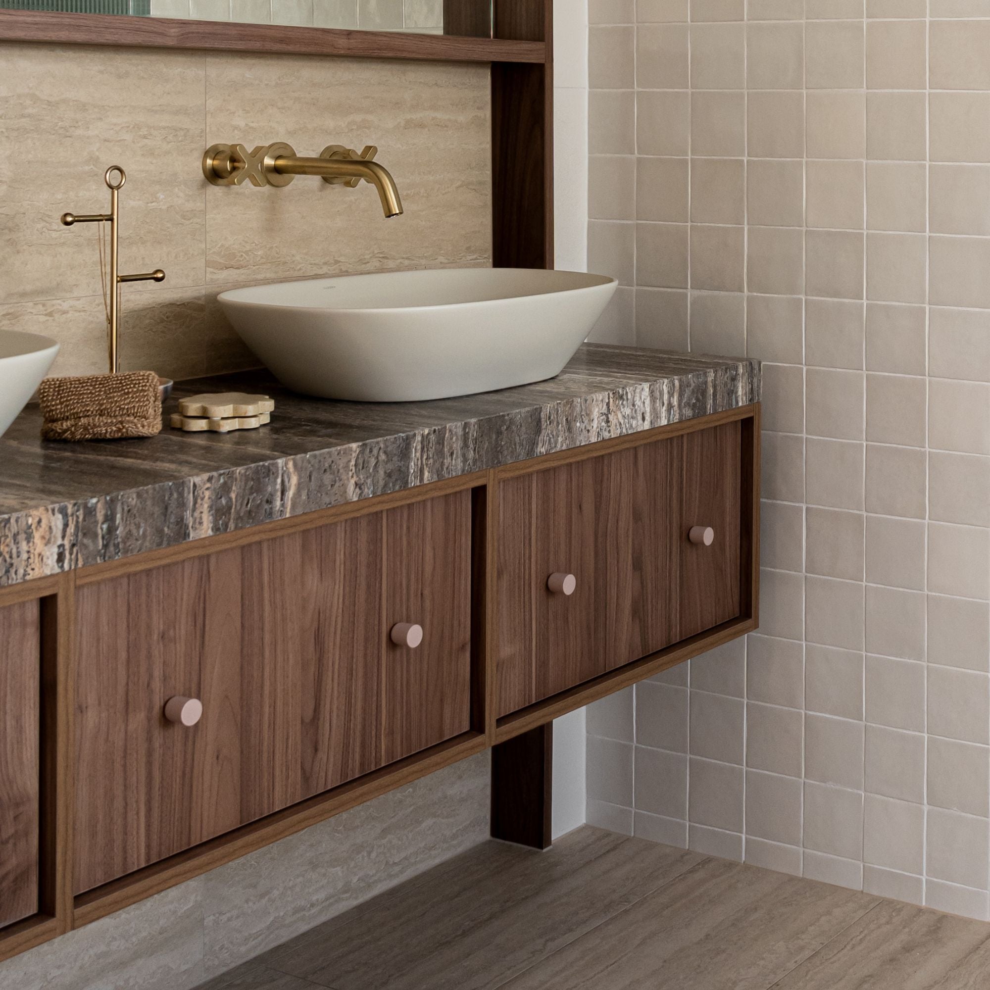 Surrey Hills by GIA Renovations showcases a calm, refined bathroom defined by warm walnut tones, natural textures and softly curved forms. An arched mirror anchors the double vanity, while layered materials and gentle colour create a sense of balance and quiet luxury. Finished with Dune knobs in a Dusty Rose finish, the joinery details add a subtle warmth and tactile elegance, enhancing the bathroom’s serene, contemporary feel.